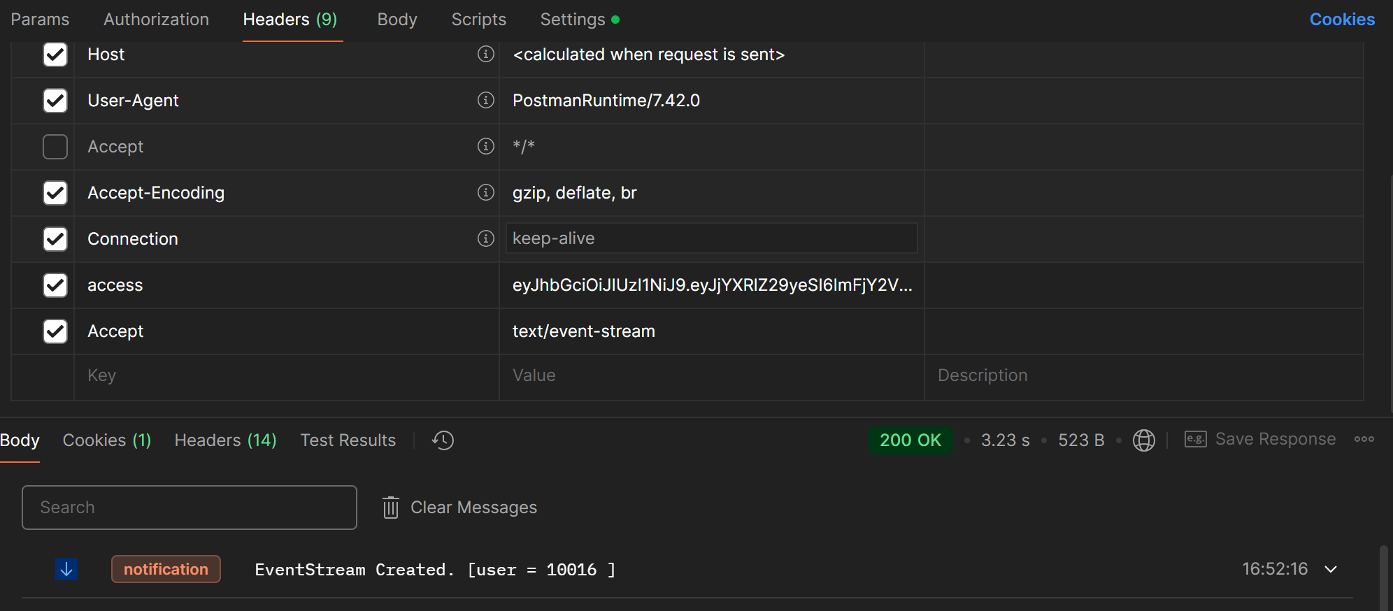 헤더에 Accept를 text/event-stream으로 지정하고, GET 요청을 보냅니다.