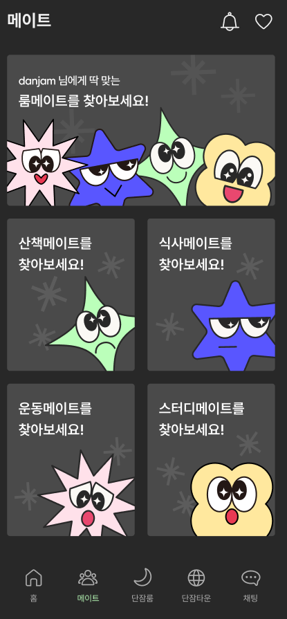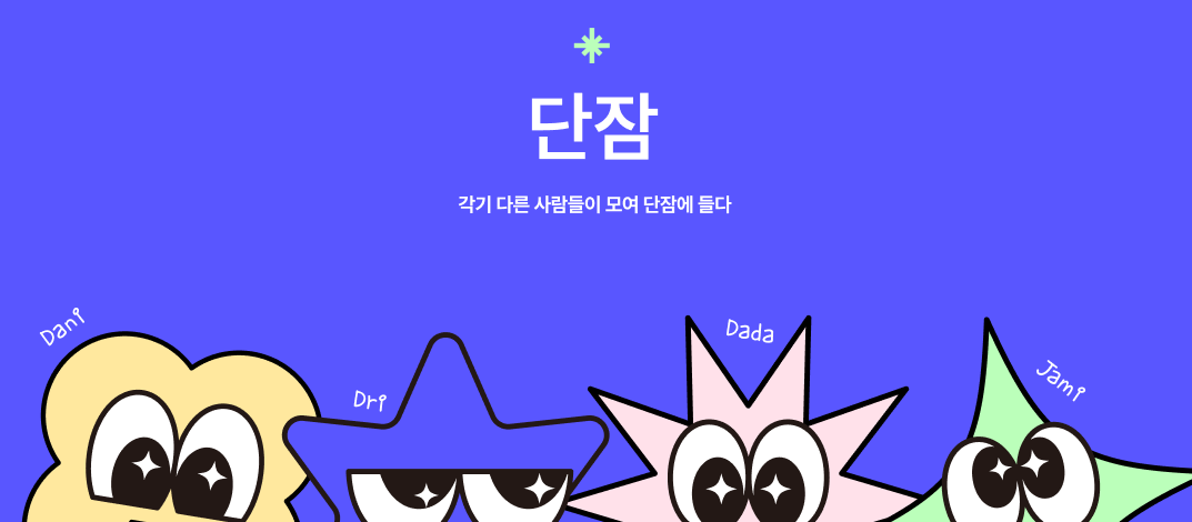 ✨ 단잠 / 각기 다른 사람들이 모여 단잠에 들다 ✨ 단잠은 대학교 기숙사 메이트 매칭 및 대학 생활 커뮤니티 서비스입니다. 기숙사 메이트 매칭 외에도사용자의 성향에 맞는다양한 운동, 산